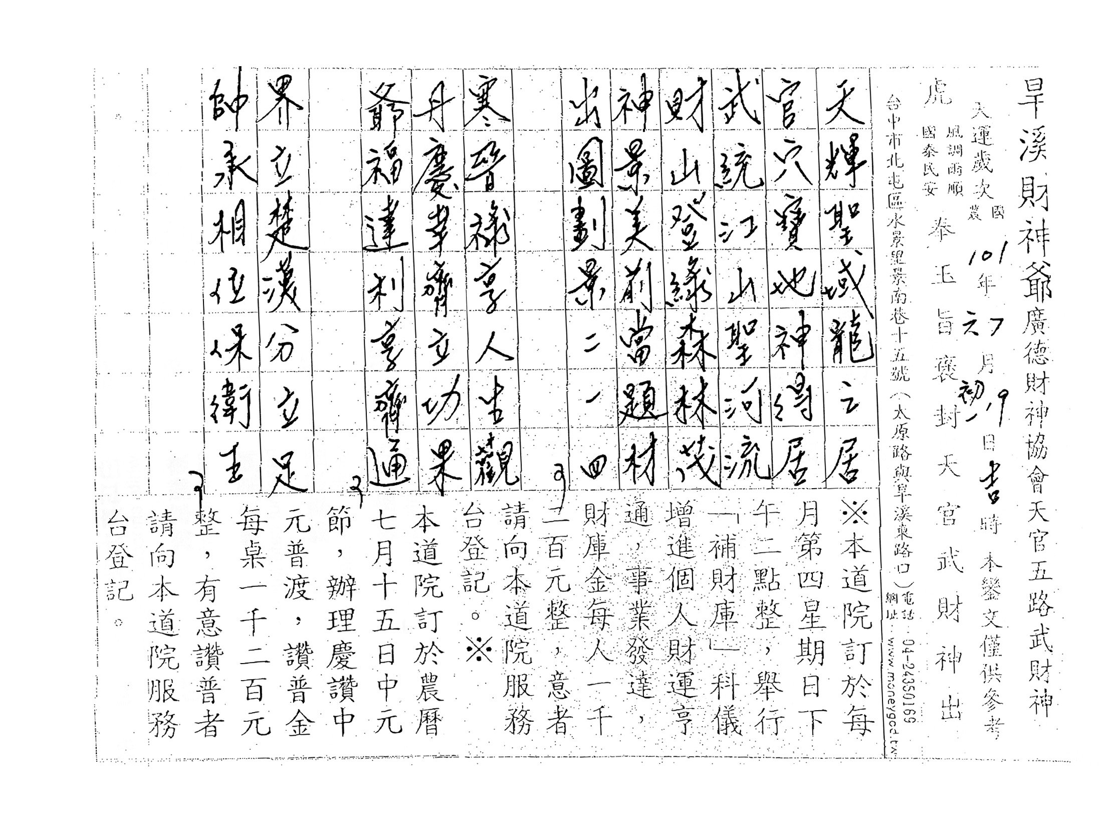 <公告> ※本道院訂於每月第四星期日下午2:00整,舉行『補財庫』科儀,增進個人財運亨通,事業發達,財庫金每人1200元,意者請向廣天道院服務台登記。 ※每星期二、四 晚上8:30 濟世。 地址:台中市北屯區水景里景南巷15號 電話:(04) 2435-0169 (太原路與旱溪東路口)