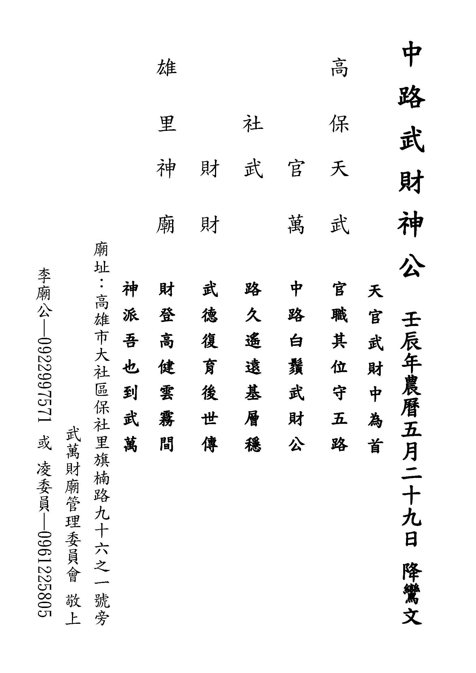 高雄武萬財廟 壬辰年農曆五月廿九日 降